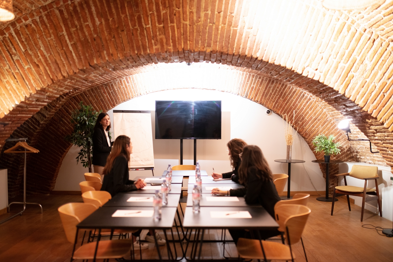 Installée dans un espace au cachet unique avec briques toulousaines apparentes, elle offre un environnement calme et chaleureux pour garantir la réussite de votre événement.